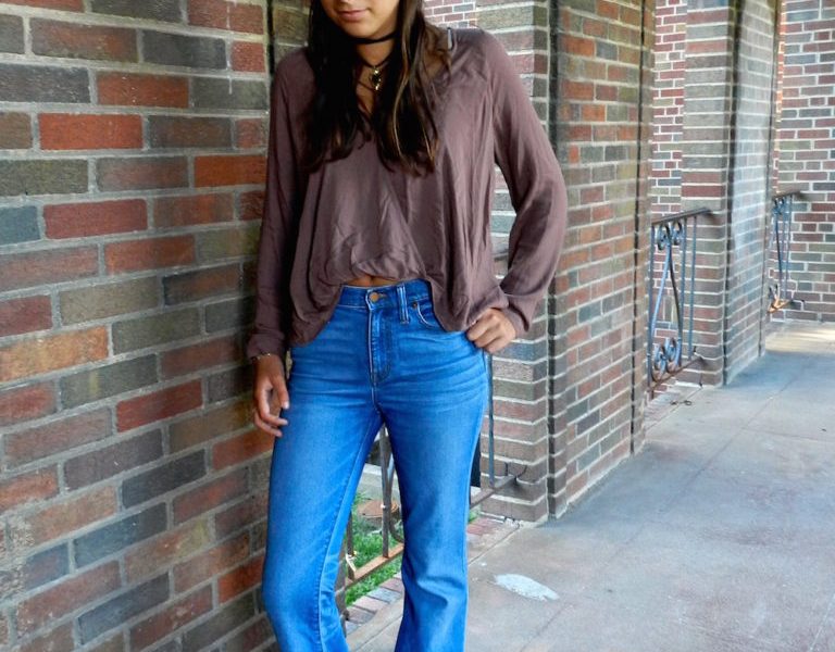 For starters, the whole look emanates fall vibes from the earth-toned shirt all the way down to the suede booties. Her effortlessly boho style resembles her California roots while adapting to the midwestern lifestyle. The flares really embody the ’70s trend that’s been popping up for the last couple of months. But aside from the major pieces, her true style lies in the details. I absolutely love the cut of the crisscross top that can be worn during the day, or it can transcend to night by adding a simple bralette with a deep V-neck. The light wash of the flares make it wearable to class while the booties balance out the entire look, yet are still comfortable enough to walk around campus all day in.