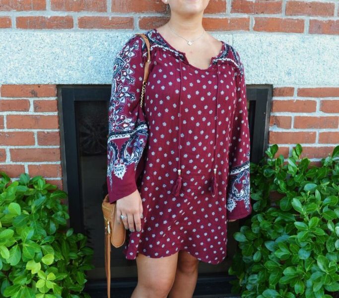 My lovely model here threw on a burgundy shift dress, riddled with bohemian details all throughout. Another thing I love about this time of year is bohemian style. Even though most people believe bohemian fashion thrives during the summer, I’m a firm believer that the best time to wear flowy dresses and ripped up sweaters is during the fall. It’s also a great time to break out the dark nail colors and fall bags. Add some trendy sunglasses to protect your eyes from those vibrant autumn sunsets, and you are all set to jump in the leaves.