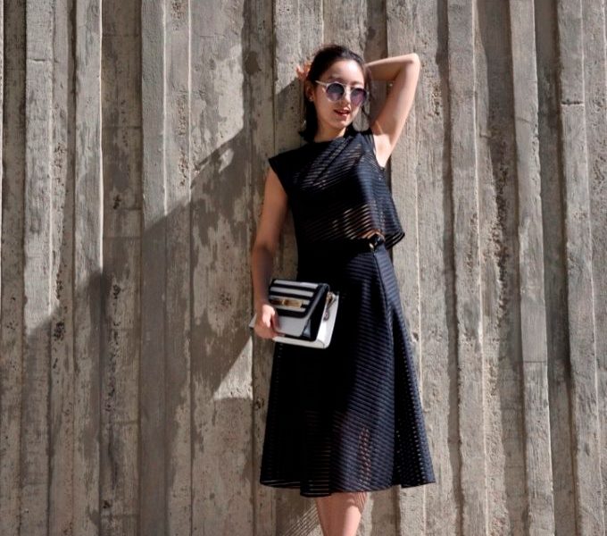 With regards to Jiasui’s look, she paired an opaque and translucent black striped high waist skirt with its matching crop top. A simple pendant necklace helped to keep the attention focused on the outfit adding a bit of movement to it. Moreover, she accessorized with a black and white cross body purse that she lightly slung over one shoulder, not to cover up or distort the outfit. In order to break away from the seriousness/professionalism of her outfit, Jiasui wore stylish bold circular sunglasses that definitely make a statement! The black point toed pumps were just enough to finish off her look, not taking away any attention from the main look. However, for a more subtle look, the heels can be swapped for a nice pair of flats and the cross body purse for a larger tote. What I also like about this look, is that it can easily be turned into an evening outfit by throwing on a trench coat over it or even into a business look with a chic shorter blazer. This is definitely one of my favorite looks I have seen in New York so far!