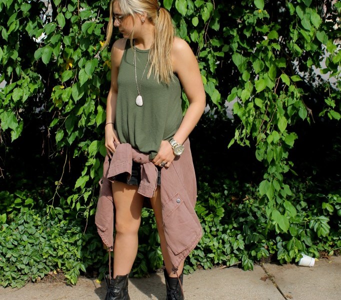 She stays cool with a high-neck tank top and distressed black shorts. However, it was smart of her to bring along a jacket just in case there was a surprise spring shower. She kept the color scheme pretty neutral, so she didn’t have to put too much thought into matching colors. Her combat boots are ready to take on any incidental mud patches, and her accessories pull it all together.