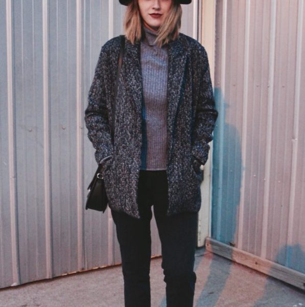 In order to be a proper Fashionista I also have to have this season’s trends in mind. In order to decide what to wear there are many other factors involved. How well do these trousers complement my bag? What is the weather like outside? Do I feel like wearing lipstick today? You know, the everyday struggle. With all reasons considered, I chose a high shaft black Chelsea boot to pair with loose fitted navy trousers. I decided to add texture to the outfit with my heathered, thrifted turtleneck and a patterned navy and white coat. Overcoats with a twill or plaid detail are on trend for this season, along with chunky heels on boots. To finish the outfit, I pulled it together with a black wool hat and a dark matte lip. Even though turtlenecks are not my favorite garments, the high neck keeps me warm and is a great substitute for a scarf.