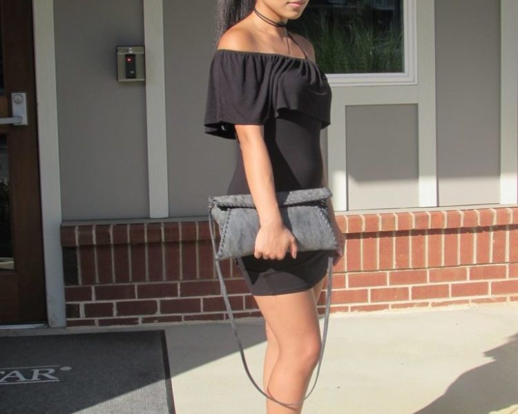 Wearing all black during the summer can be tricky but the dress this Fashionista has a light enough material to keep her from burning up. The off-the-shoulder trend is a huge hit this summer. Another favorite trend of mine is wrap chokers. They remind me of men in old western movies but it’s perfect that they can be pretty stylish on women too. Fierce outfits like this don’t call for more accessories so this Fashionista kept it simple and chic. To continue that western style, this Fashionista is wearing a cross-body leather bag that has braided edges. This particular piece is so versatile because it could also be a clutch, perfect for holding at the club. Her sandals have heels on them, but luckily they are chunky so that makes walking much easier. To top it all off, her green Ray-Bans are classic for adding a pop of color to her all black ensemble.