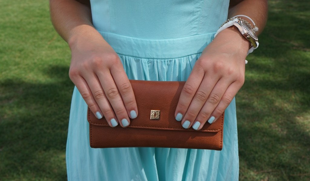 The answer is showcased perfectly on this Fashionista. She dons a breezy Tiffany blue-colored skater dress that sways beautifully as she walks ahead of me. The cross back straps add character to her simplistic dress and will definitely be in her favor as the Florida summer sun beats down on everyone gathered for graduation. Continuing with my favorite “less is more” approach, this blonde beauty keeps her accessories simple with a few white arm candy pieces and a camel-colored wallet. Furthermore, her wallet complements her camel-buckled wedge sandals, a foolproof choice of footwear for adding height without sinking one’s heel in the grass as they are frantically running around looking for their graduate. Let’s have a round of applause for this Fashionista for executing this graduation outfit so effortlessly!