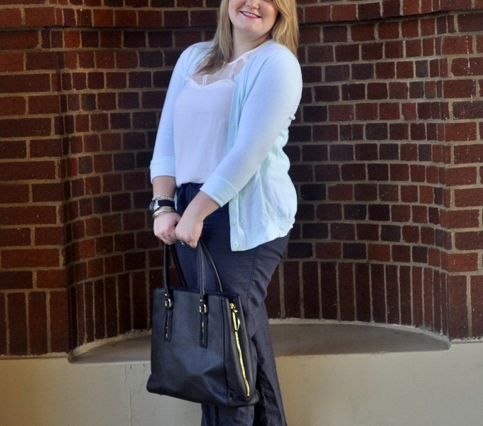 This Fashionista is dressed to impress. Her outfit proves that, yes, she is ready to take on any internship that is given to her. She did an excellent job pairing trousers with a white blouse and throwing on a light blue cardigan. The detail on her collar is subtle, but is pretty enough that she can skip wearing a necklace. However, just because she is not wearing a necklace doesn’t mean she forgot about accessorizing all together. She is toting the perfect bag to wear to an internship. It is big enough to carry a laptop, which is something most interns need on a daily basis. It is a better and stylish alternative to carrying a backpack. Wedges, like the ones she is wearing, are a really good substitute to wearing kitten heels and are much more comfortable, especially when there are long hours ahead.