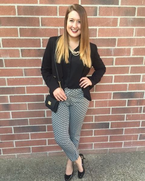This Fashionista put together a lively yet professional look for her upcoming interview. She is sporting a black blazer from Forever 21, a black button-down blouse from Express and black and white pattern dress slacks from H&M. A blazer is my go-to article of clothing when it comes to interviews. Blazers are classy, come in a large variety of colors and always look nice over any top. They are easy to pair with anything, especially a neutral colored one such as black. Her bottoms are my favorite part of this outfit! Never be afraid to play around with patterns, as they make such a great statement, especially at an interview. These slacks liven up her outfit so much and will catch anyone’s attention the minute she walks through the door. How could the interviewer not remember her after this?