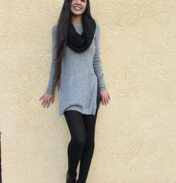 In this cold weather, it may be hard to stay warm and stylish at the same time. Layering is a great way to keep warm and feel like a stud this winter. I found this Fashionista rocking her gray and black cotton-based outfit. The scoop neck sweater dress was purchased from Forever 21 along with her black knit leggings. An accessory that tied things together was the H&M knitted infinity scarf. This is very cozy for a casual winter walk. She wears thick black leggings that keep her warm under the dress along with fuzzy socks tucked in her booties.