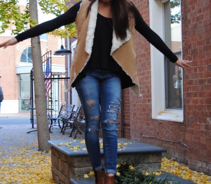 This Fashionista is cozy in her Free People long sleeve thermal top, layered with the cutest Altar’d State suede vest. She wore ripped jeans to give it a more casual day feel, but if she were to switch the look up with some leather leggings, she’d be ready for a night out.