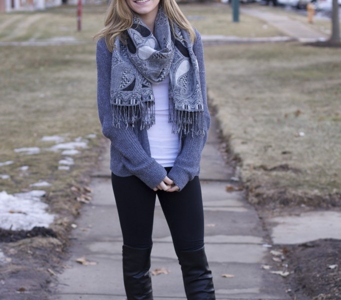She keeps it cute and comfortable with her black leggings paired with a simple white tank top and gray cardigan. To add some flair, she added a fun paisley blue scarf and knee-high black boots. It is not often that you see paisley patterns in winter, being that it is usually associated with spring, but I love it here. The cool blue and gray tones of the scarf tie in nicely with her gray cardigan. These hues take this paisley from spring to winter. But seriously, can spring hurry up already?!