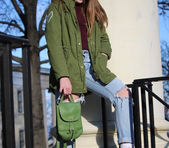 This Fashionista covered all the winter essentials in a stylish way. The basic army green winter coat has been a trend for a couple seasons now but always matches nicely with a multitude of outfits. It was paired with a maroon turtleneck for some contrast. While many think it’s too cold for ripped jeans in the winter; that is definitely not the case. Light wash ripped jeans add a little edge to the outfit. This Fashionista snagged these jeans at a local thrift shop. She added her own style to them by creating rips in the knees and one at her thigh. You can even add tights underneath to add some flare and warmth. While finding the perfect pair of shoes for the winter, this Fashionista chose classic Timberlands. They are very versatile and warm. Timberlands match with your favorite ripped jeans or a pair of leggings and a sweatshirt.