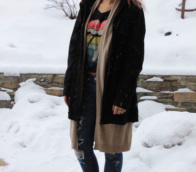 This Fashionista is rocking her outfit from head to toe, as I was able to spot out her pink hair right away. The bandana is the new trend and can be seen in this Fashionista’s hair. Wearing a bandana on your head, neck, or wrist will add immediate grunge to your look and is an easy accessory. A graphic T-shirt is always my favorite addition; they are so comfortable but add so much to any outfit. This outfit is so awesome because of the great layering techniques this Fashionista used. The long brown sweater under a nice, black, cargo, winter coat gives layers and warmth to the Fashionista.  Layers can make a boring outfit into a great one. Ripped jeans are always a plus and are clearly very in style right now. My favorite part of this outfit is the military boots. Military boots have come and go, but these boots have a ’90s feel to the outfit. The boots look vintage and tie the whole rocker look back together.