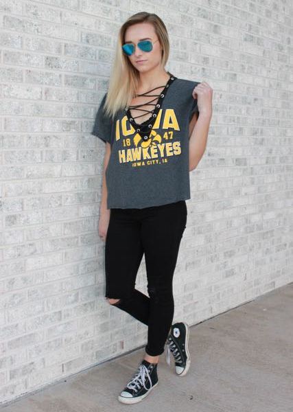 This Fashionista paired her DIY cropped, graphic lace-up T-shirt with a black lacy bralette, distressed black denim, classic black and white converse and accessorized the look with blue aviator sunglasses. This look is an inexpensive way to incorporate fall trends into the football season attire or create a rad DIY project to spice up your wardrobe of old graphic T-shirts.