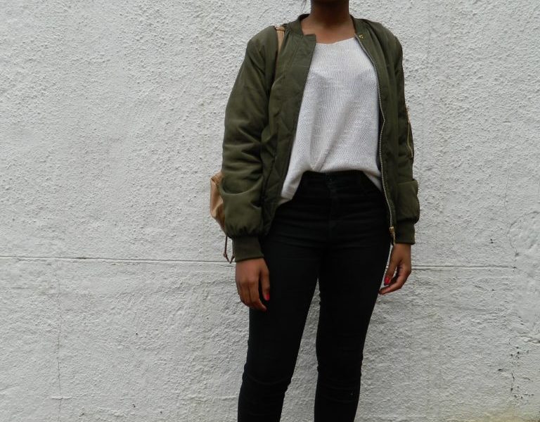 This Fashionista is one example of many diverse styles that can be spotted on campus. This relaxed look was put together with simple pieces such as a pair of black jeans, cotton sweater, and slip-on sneakers. This look was pulled together with a bomber jacket and a cute backpack. Although this is a simple look for class, there is still a sense of edge and style to this look. It’s such an eye-opener to see how so many people are able to show their individuality through the way they choose to put together different pieces of clothing, in a way that they feel expresses them best.