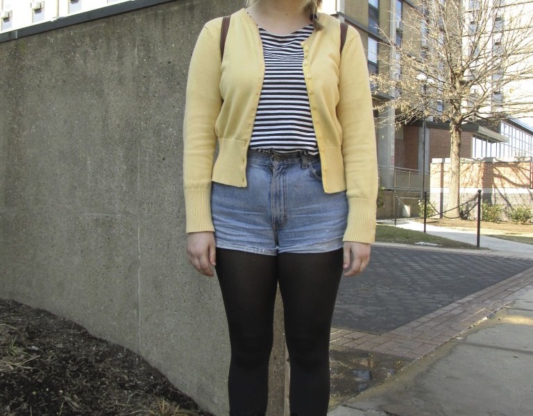 Today’s Fashionista had the right idea. She wore a a pair of high-waisted denim shorts over a pair of black tights. She tucked a loose fitting striped T-shirt into her shorts and layered a pastel yellow cardigan on top. The shorts and pastel aspects of her ensemble were cheerful and totally spring appropriate. Since it was still a little breezy out, wearing tights under shorts was a great choice.