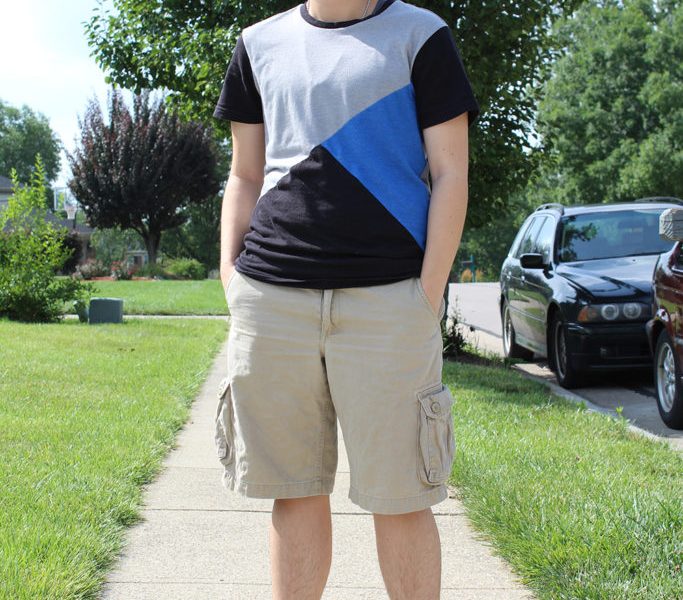 This Fashionisto chose a simple pair of khaki shorts to pair with a perfect geometric patterned T-shirt. Khakis, both shorts and pants are a great staple item to have on hand for casual outfits. They can be paired with many colors and patterns and are loose, light and comfy while still looking cool. His shirt features a sleek divide between colors, creating an eye-catching pattern that pairs well with his minimalist tattoo. Geometric patterns are a fun way to display multiple colors without straying from a simple, casual look.