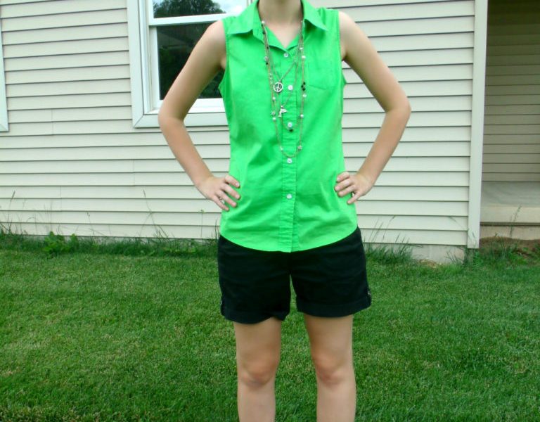 Take this cute Fashionista’s look for example. She pairs a simple sleeveless button down shirt with black shorts. The outfit is so easy and looks cool and comfortable for being outside in summer. Her bright green top gives a pop of color to her simple outfit like a cold, refreshing lime popsicle! On her feet, she has a pair of cute little boots, which are perhaps a more practical choice than dainty sandals for running around on the streets or exploring a forest. She finishes off the look by layering on some fun necklaces to give her look a bit of sparkle and personality.