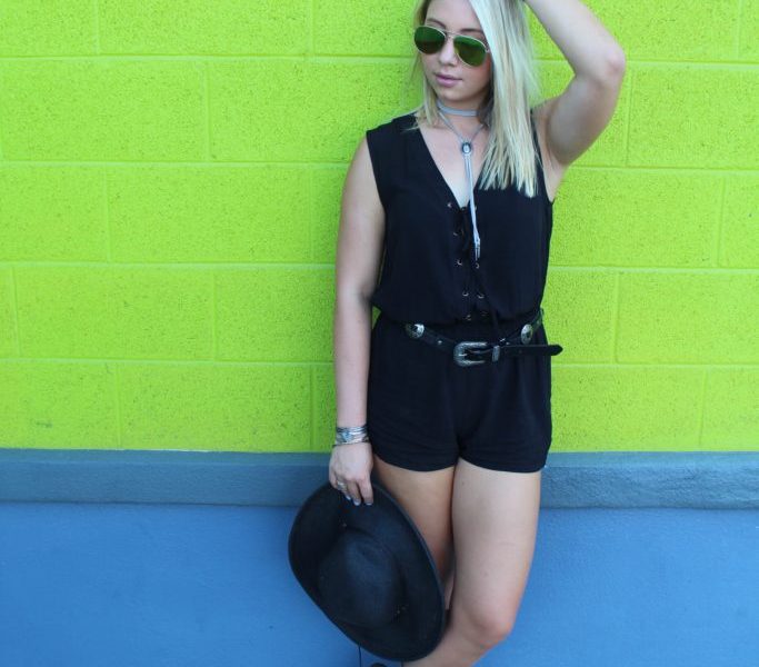 You don’t have to leave your favorite winter or fall colors behind, especially darker colors such as black. This Fashionista rocks an edgy look and color by wearing a black romper and a silver belt to not only lighten, but to cool off this “bad-girl” look (even though it is hotter than hot). I can’t blame this Fashionista for still wanting to wear black, not only is it a safe color that can be dressed up or down with the addition or subtraction of accessories, but it is a timeless and always flattering choice. Clearly, this Fashionista knows how to work her angles and catch the perfect light with western inspired bangles and bolo ties. One of the major issues that we Phoenicians battle is sun exposure; with temperatures of 110º and higher, going outside means lathering up with sunscreen and shielding ourselves from the sun. It also gives us an excuse to wear some pretty rad hats and shades. Like this Fashionista, many Phoenicians wear hats that seem to be ready for a festival or a cool place to call home. Not only do all of these accessories make this Fashionista’s outfit come together, but they all add up to make the perfect outfit for any summer fling. Forget the popsicles and pastels, I’ll do bad-ass and black.