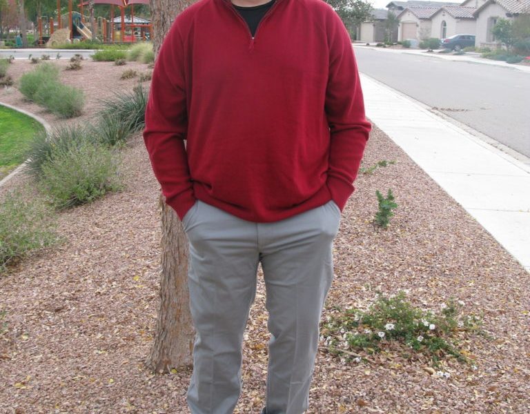 I thought that this Fashionisto’s simple, classy, and clean style perfectly represented men’s winter fashion in Arizona. On top, he is strutting a plain red, half-zip turtleneck, which is not only an ideal color for the holiday season, but the zipper is perfect to zip up for extra chilly mornings, and to zip down just in case the temperature decides to climb a few degrees in the afternoon. On the bottom, he complements his red sweater with a pair of light gray dress pants, which would go perfectly with any other color that you decide to wear. For shoes, this Fashionisto chooses a pair of classic Sperry boat shoes in Sahara Leather.