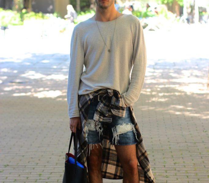 This Fashionisto was spotted leaving his first class of the day, keeping his spin on grunge casual and chic. Seen here wearing an off-white sweater and distressed denim shorts (which he made himself), he’s also tied a large, yellow and grey plaid shirt around his waist, wearing it long to give the effect of a kilt from behind. He accessorized with a long pendant and black leather, studded oxfords to give the look more of a McQ vibe than a Cobain one. Topped off with a pair of navy blue horn-rimmed sunnies and an Yves Saint Laurent-esque black leather tote, this Fashionisto is ready to hit the books in style.