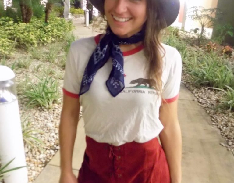 She is wearing a skater type shirt that cuffs off at the neck and arms; it is tucked into a suede lace-up skirt. I love the fact she is not rocking any jewelry, just a cute bandana around her neck. This is a great accessory you can pick up at Walmart for less than a buck! To accessorize she is wearing a trendy brimmed hat tipped back. This is a cool trick to add a different look to your hat.