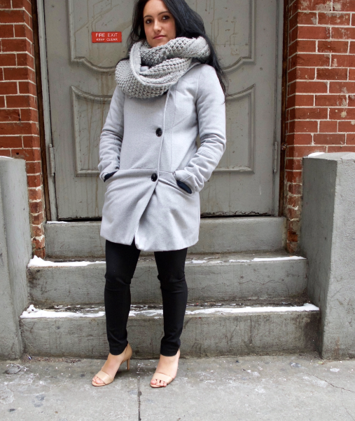 Her look here provides a nice balance of student and work life. This Fashionista has some black pants on, which can be worn for any occasion, and a nice thick jacket, as it was about 30 degrees that day. Along with that jacket, she accessories with a long matching gray scarf, and some nude heels. Similar to the one’s this Fashionista is wearing can be found at these two links!. She tells me she always keeps a pair of flats or heels in her bag, in case she decides to go into work. She also keeps a spare pair in her office, at work, as well. When she walks into work her boss mode comes on. When she steps into school her student mode comes on.
