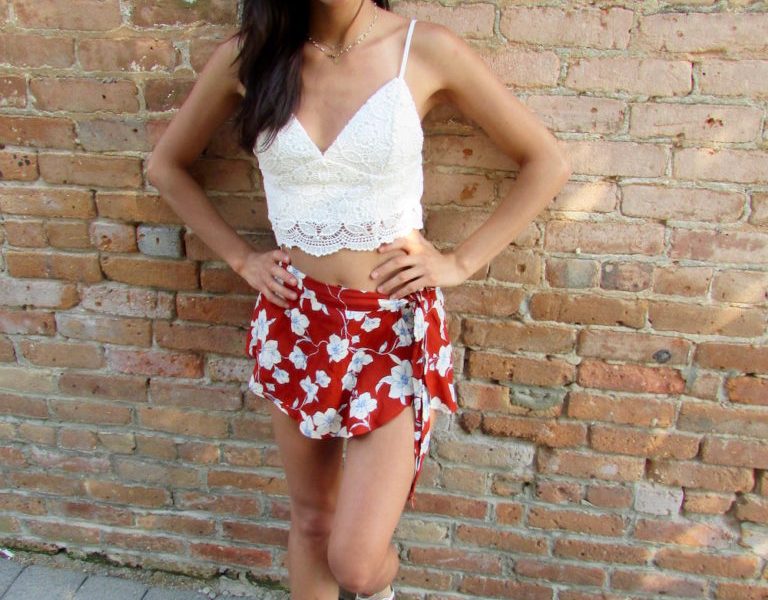 Vacation time is exciting and relaxing. Continue that vibe by picking summer colors that accentuate the season and your mood. Pops of color are your best friend on your time off. In this look, the Fashionista centers her outfit around the bright hues of orange and blue in her skort. She pairs a classic white lace crop top and  matching white sandals to balance out the look. This Fashionista uses minimal jewelry to add small details to her look, particularly gold jewelry to accentuate her summer tan. She finishes off her outfit by throwing on a fun pair of sunglasses. Her rose gold sunglasses are the perfect subtle accessory to complete this look.