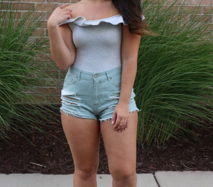 All fashion lovers who are currently raving about the beloved bodysuit will be sure to enjoy this ensemble. The bodysuit paired in this look features an off-the-shoulder cut with ruffle detailing to finish it off. This look also includes a classic pair of light green, ripped denim shorts—which are always a staple in any closet. When it comes to accessories with this look, less is more. Pairing a simple gold ring with the light color palette in this ensemble keeps things simple, yet still fashion forward.