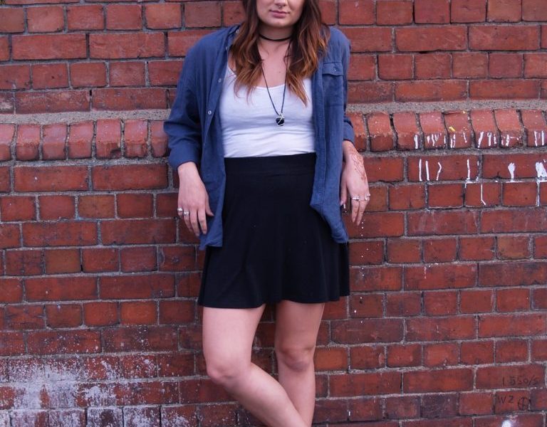 This Fashionista pairs a black above-the-knee skirt with Converse, a look that’s versatile and flexible for whatever the weekend may bring her. In this outfit she is concert, party and cafe-ready all in one!