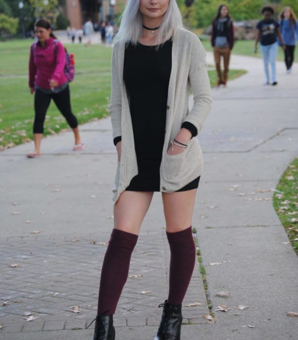 This particular Fashionista is wearing an ensemble perfect for a fun weekend out and about. The ribbed beanie and long cardigan give the look a cozy feel. Plus, the knee-high socks keep legs warm, but still provide for a little bit of breathability. The long sleeved black dress adds an extra layer of warmth to the look as well. The simple choker with a single pearl adds a little edgy oomph to the ensemble. Not to mention those faux leather, lace-up booties? UGH, punk perfection!