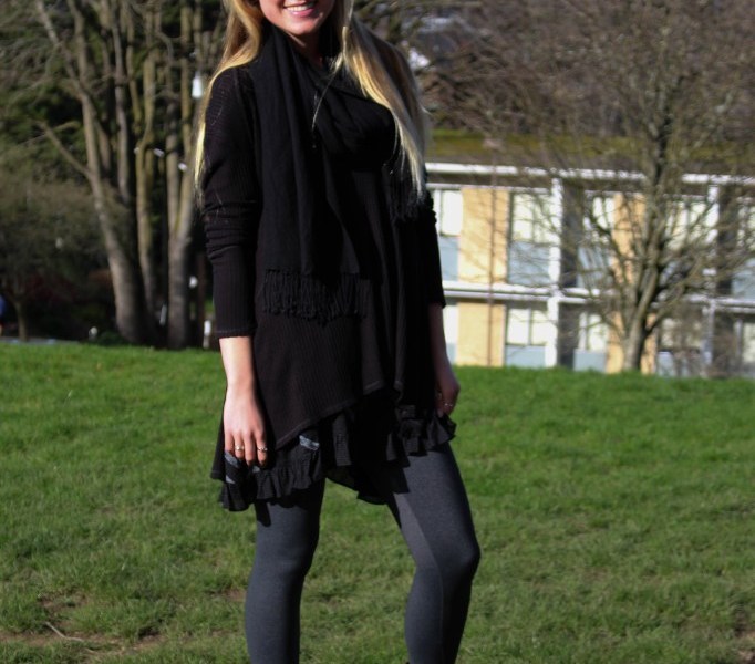 This Fashionista shows us how to layer her black Free People dress under another Free People top, this time a cozy black sweater. She pairs these pieces with simple, dark gray leggings, which makes this look easy and casual. They’re perfect for weekend wear. She finished off the look with minimal jewelry, choosing to focus on a chunky black scarf, a black wide-brimmed boho hat and her brown combat boots that evoke an equestrian feel. This look instantly makes me think of her strolling through a farmer’s market on a sunny Saturday or spending time with friends at brunch or an art museum. It’s casual, soft, neutral and cute, and it looks extremely effortless and easy to wear. This look is perfect to wear in the winter months, as spring begins to creep up on us. It can even be worn without the outer layer sweater and instead with a jean jacket as the weather begins to warm up, making it a great transitional piece.