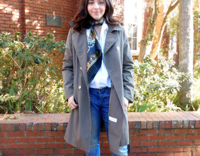 For her slim boyfriend jeans, visit True Religion. Meanwhile, similar faux suede tasseled loafers are available at Tod’s. The Calvin Klein trench coat (perfect for reenactments of the final scene of Breakfast at Tiffany’s) is, luckily, in stock. Though the white button-down and silk scarf were both thrifted, like copies can actually be found at Equipment and Fendi respectively.